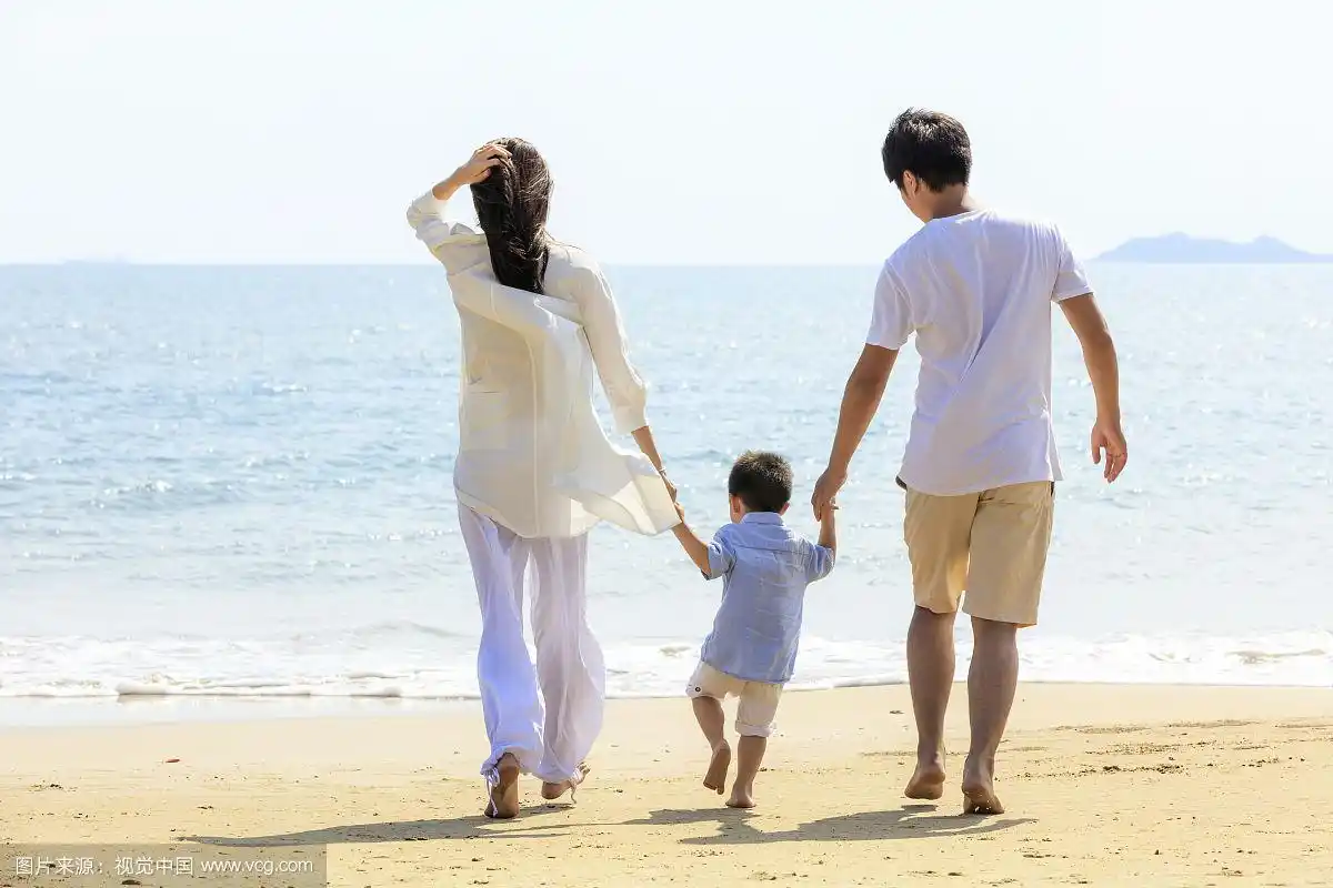 一家三口日光时分在海滩散步