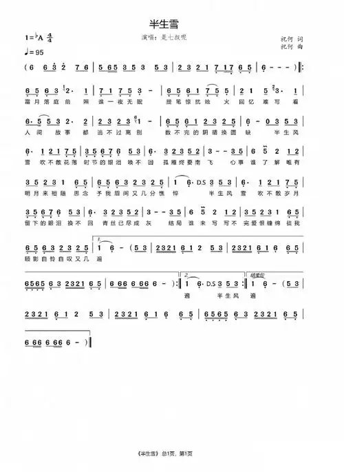 半生雪(学生版)简谱 整理了一下这首歌的简谱,有需要的随便用,有不足