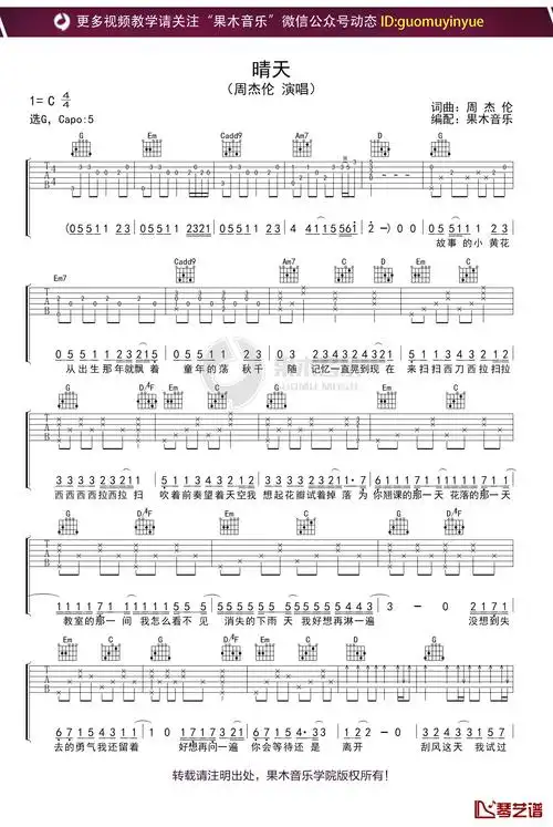 周杰伦《晴天》吉他谱_g调简单和弦编配_高清六线图片弹唱谱_悠音吉他