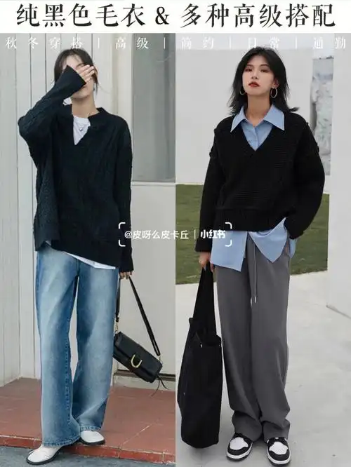 黑色毛衣搭配牛仔裤,下面一双乐福鞋或者懒人鞋,随性慵懒的休闲味道
