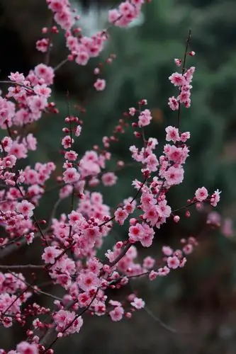 寓意着专一的爱情美人梅是从法国引进的由重瓣粉型梅花与红叶李杂交而