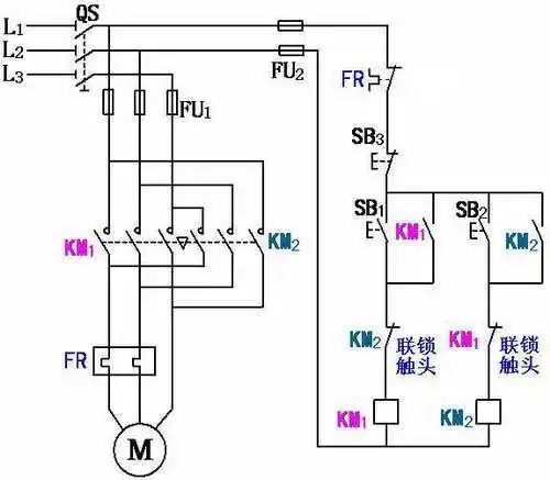 三相异步电机正反转一个急停三个按钮两个交流接触器线路图 不要解析