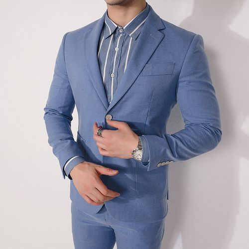 套装男士休闲西装男三件套新郎结婚礼服英伦浅蓝韩版修身四季 浅蓝色