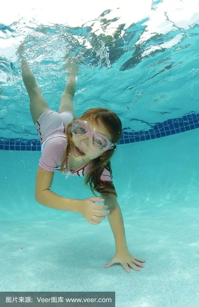 快乐美丽的小女孩在蓝色的水里游泳,露出水面微笑.