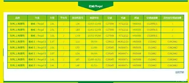 曼牌滤清器乘用车型号对照表