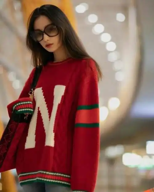 倪妮机场街拍:红色毛衣搭配修身蓝色牛仔裤,太宽松!简约又时尚