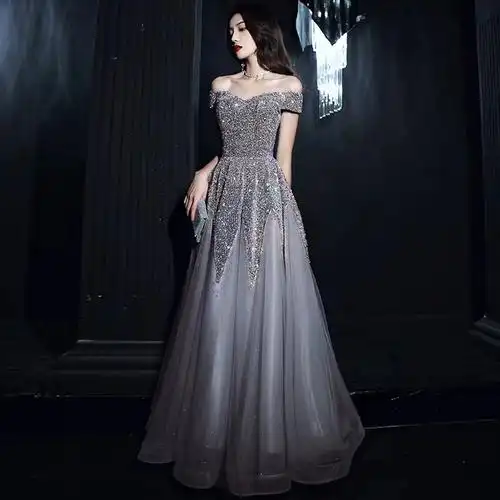 高定一字肩晚礼服重工高级质感宴会主持不灵名媛年会长裙高端轻奢