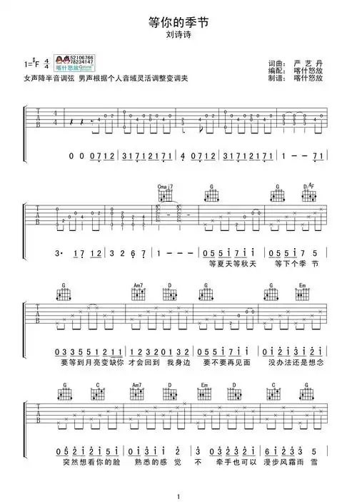 歌谱:等你的季节(喀什怒放编配版)(吉他谱)