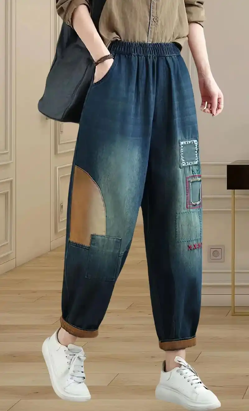 秋季大码松紧腰蝴蝶刺绣牛仔哈伦裤