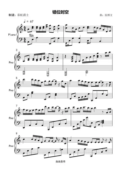 错位时空完整版艾辰c调流行钢琴五线谱