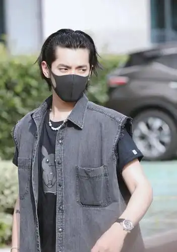 巴黎时装周的吴亦凡发型,中间部分的头发梳扎了高马尾辫,前面留出的