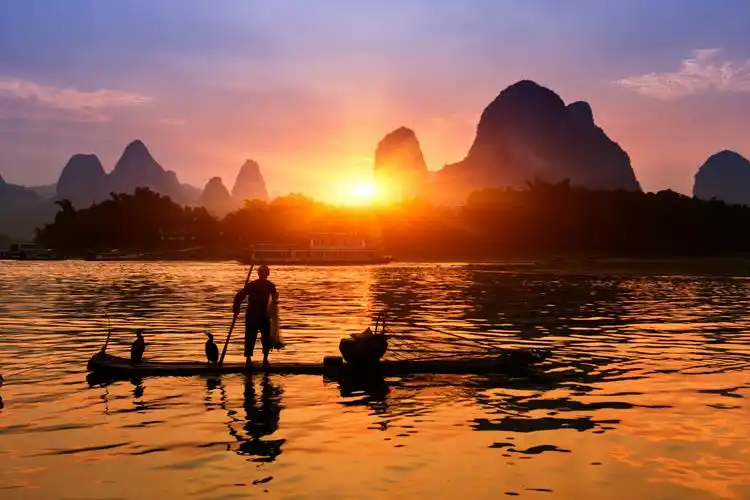 在湄公河流域的人们捕鱼和日落.泰国