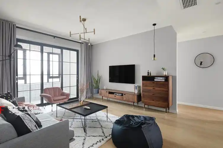 电视背景采用乳胶漆调色电视背景墙长度较长采用两边跳色对称设计增加