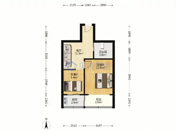 惠苑楼 2室1厅1卫 50平方卧室a5.85平米无无窗卧室b9.