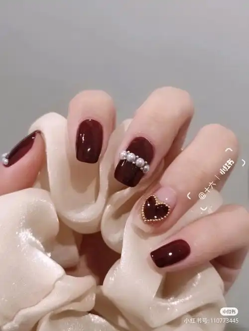 这款美甲的颜色以酒红色为主,选用黄色在指甲上写上发财两字.