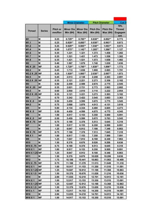 公制螺纹表格