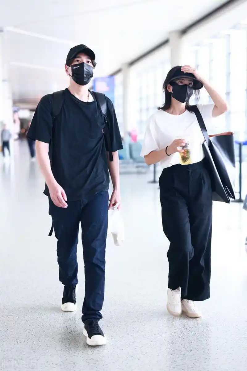 赵又廷,高圆圆夫妻二人机场街拍, 情侣棒球帽,两个人眼神拉丝,太甜啦!