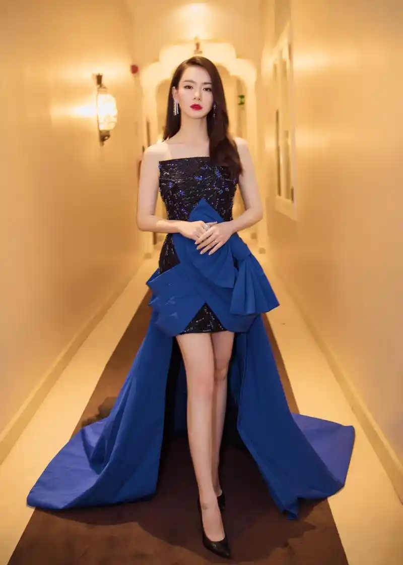 戚薇肤白貌美大长腿,这套礼服完美勾勒出她身材的优雅曲线,她如一朵