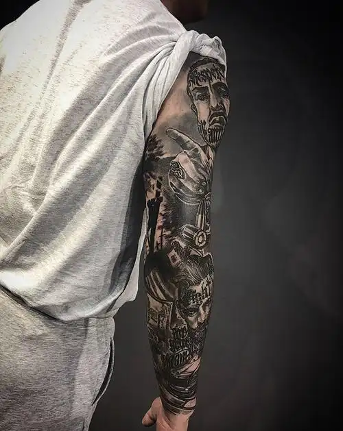 男生手臂上黑灰素描点刺技巧创意花臂纹身图片