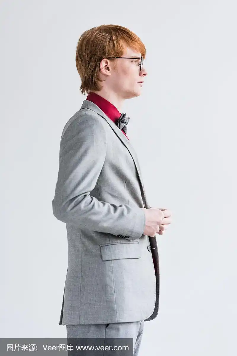 侧面肖像英俊的年轻人在黑色时尚的西装,孤立在灰色的背景.