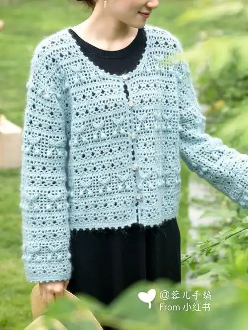 优雅端庄孔雀蓝从上往下钩美丽的钩针开衫