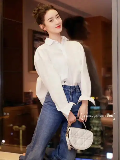 袁冰妍现身机场,白色印花t 水洗牛仔裤,简约时尚