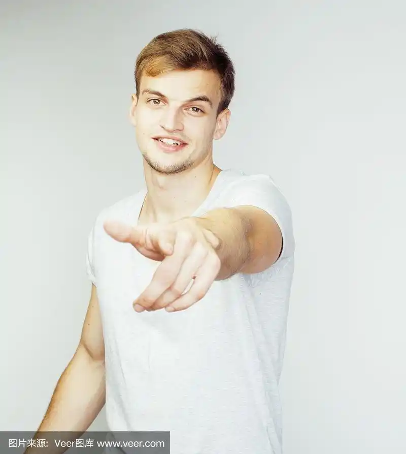 年轻帅气的男子在白色背景上打手势,指指点点,摆姿势动情