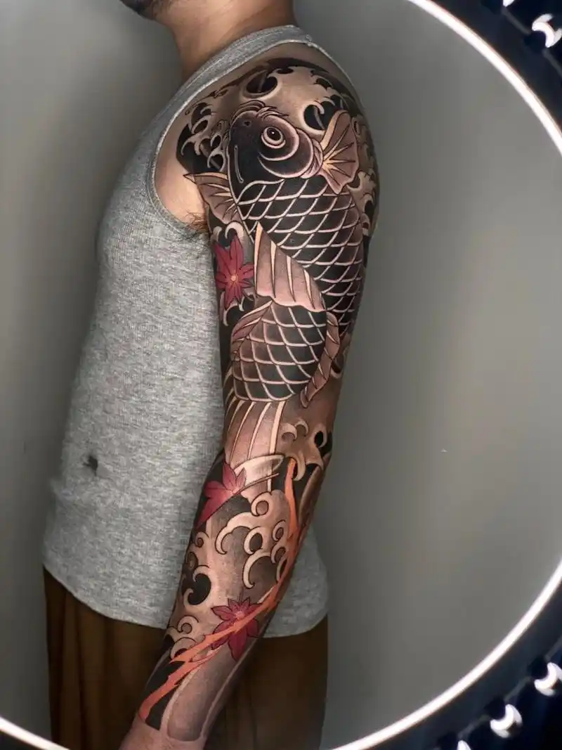 男神花臂 大臂大鲤鱼纹身