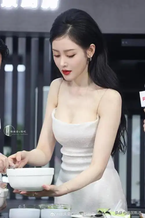 张天爱红色抹胸裙,大波浪的头发,完美的直角肩,饱满挺拔的胸部曲线