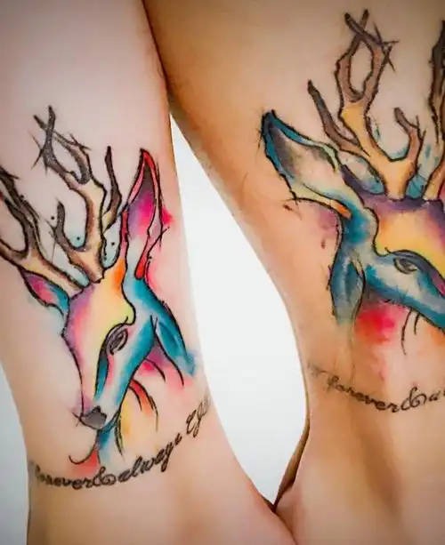 比翼双飞的幸福情侣手臂彩色纹身图案分享