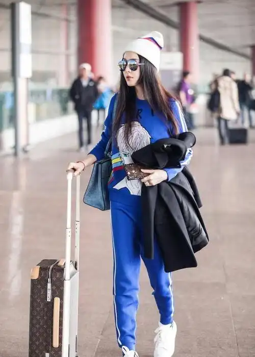 范冰冰机场太时髦穿香芋紫西服搭毛线裤长发飘飘似学生
