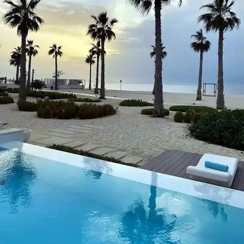 背影年轻一家四口在地处热带的海滩上照片